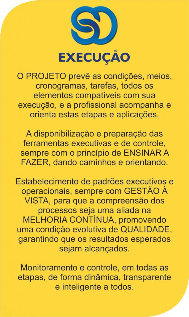 A EXECUÇÃO é preparada, ensinada, aplicada seguindo um PLANO ESTRATÉGICO, do qual todos os agentes tomam conhecimento e preparação, de forma que as etapas contem com o melhor de cada um, compreendendo os princípios, motivos e a importância de tudo o que está envolvido, de forma que exista a consciência da RESPONSABILIDADE, em nível individual, setorizado e global.